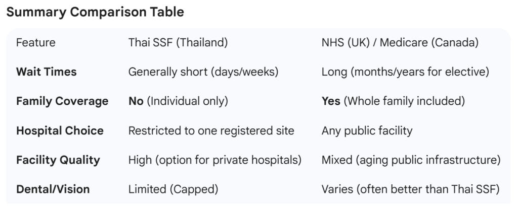 When compared to Western national health systems like the UK’s NHS, Canada’s Medicare, or Australia’s Medicare, the Thai Social Security Fund (SSF) is a high-performing but different model. It is often described as a “dual-tier” success story: it provides world-class efficiency and speed, though it lacks some of the “cradle-to-grave” breadth found in Europe.